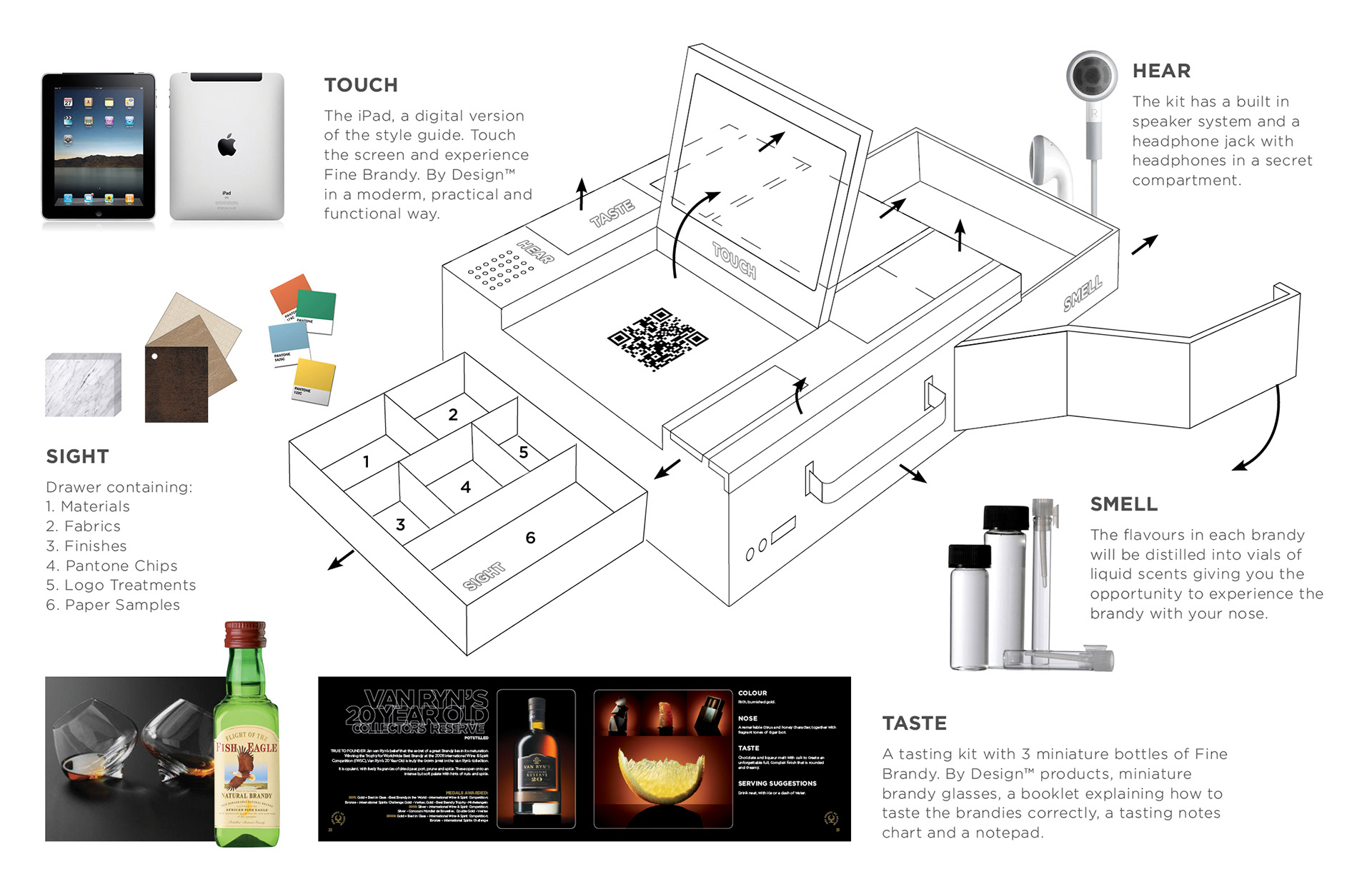 Design a premium style guide for Fine Brandy. By Design. A collection of all the best brandies in South Africa. A style guide to stimulate your senses. Sensory Stimulation. By design. In order to truly understand and get to know Fine Brandy. By Design™ I created an interactive experience that stimulates all five of the senses. The kit is designed with various secret compartments, hidden drawers and interactive components making it a truly unique and entertaining experience. It is made of white and clear perspex, white polycarbonate plastic and aluminium to give it a modern, premium and sophisticated look.